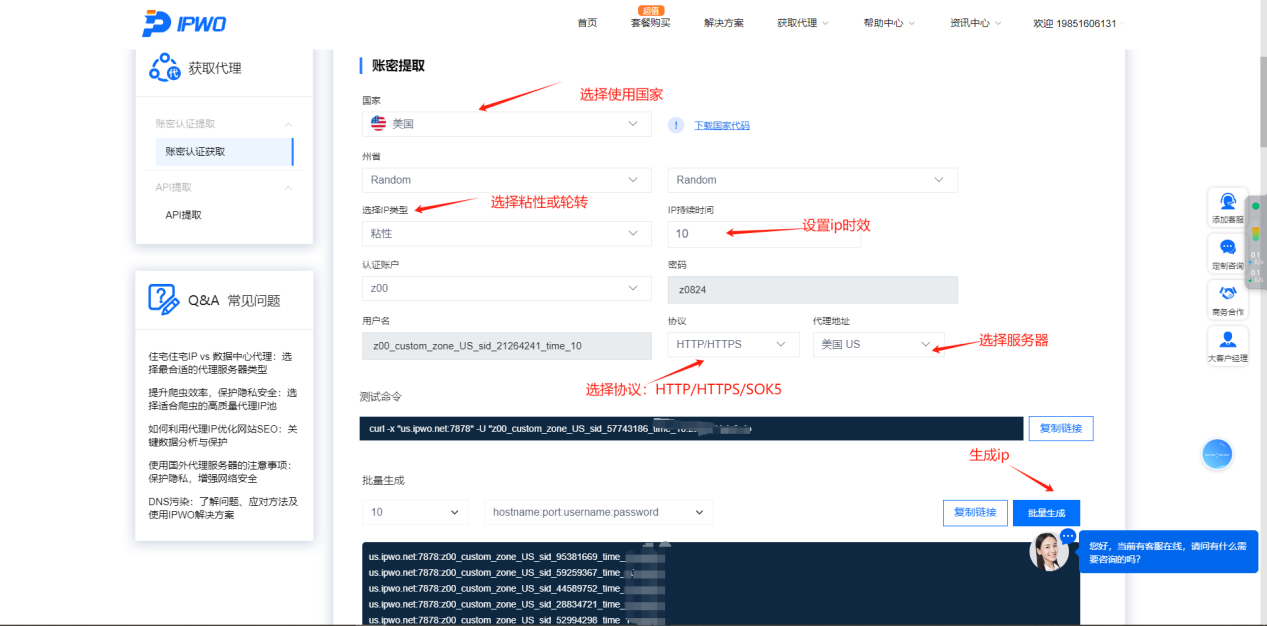 【测试命令】处会生成代理信息,如curl -x "us.ipwo.net:7878" -U "