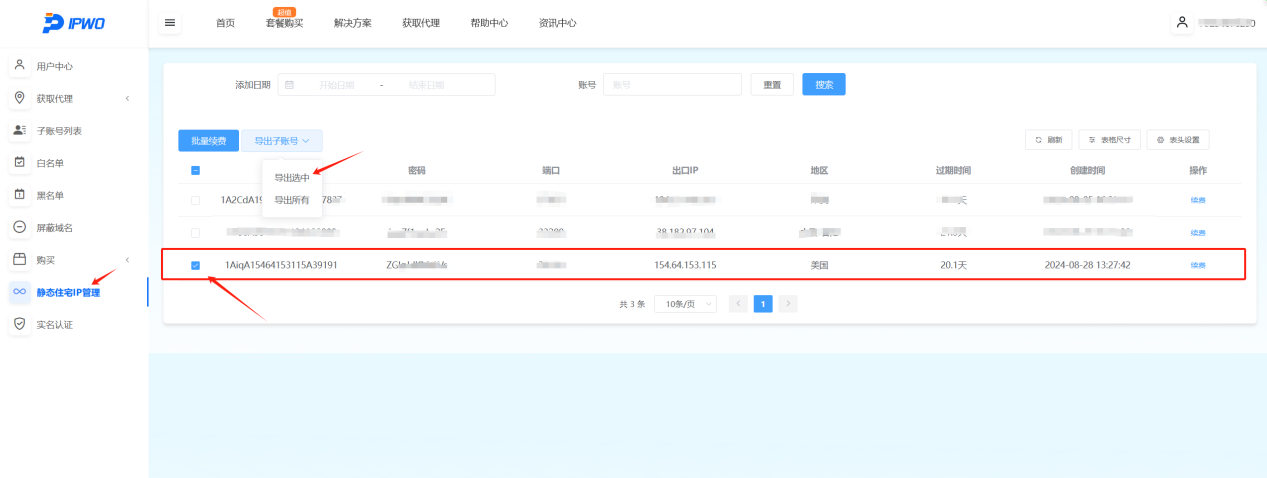 2.点击【静态住宅IP管理】——【点击购买选择使用IP】——【导出子账户】