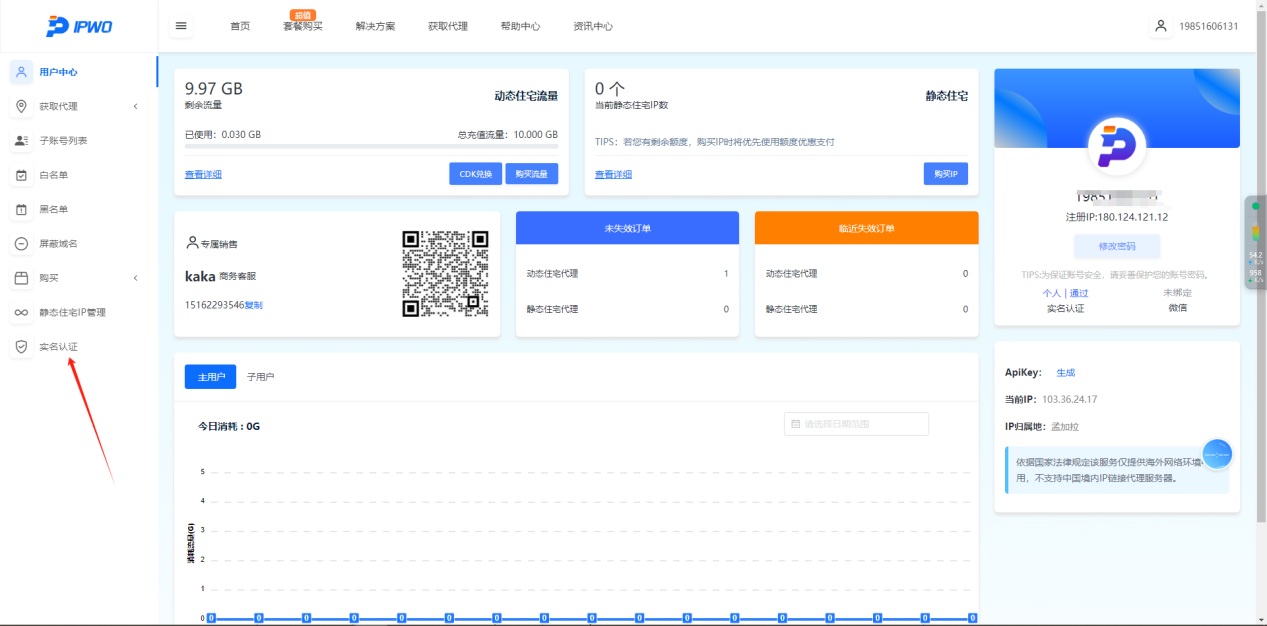 1. 注册并登录IPWO.NET后台,根据引导流程,完成实名认证,并领取免费测试