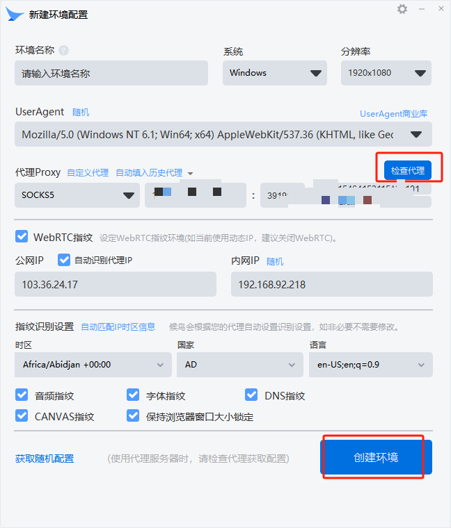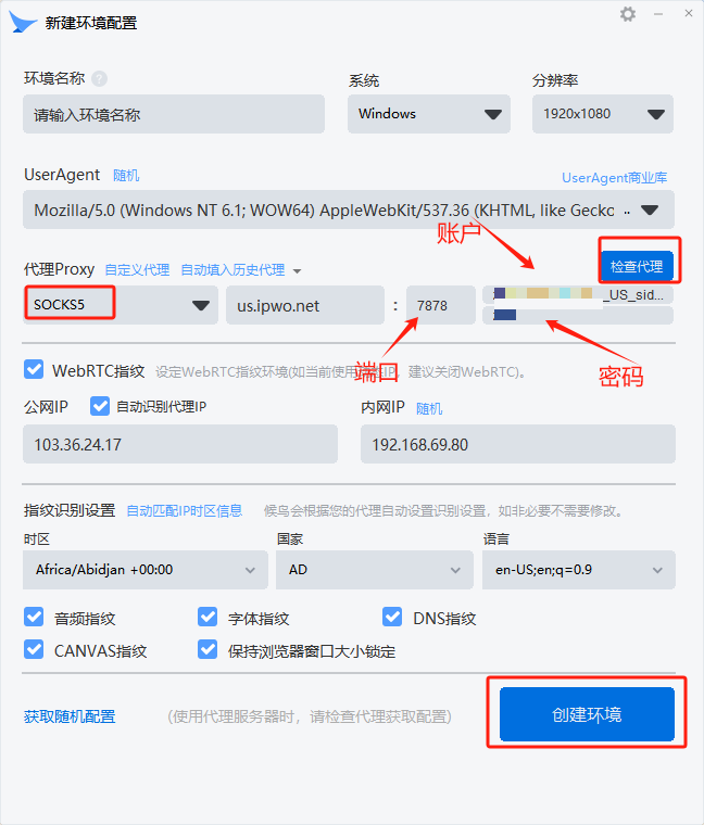 3. 把在提取的代理IP,分别填写至相应的字段,然后点击【检查代理】,测试成功后,点击【创建环境】保存