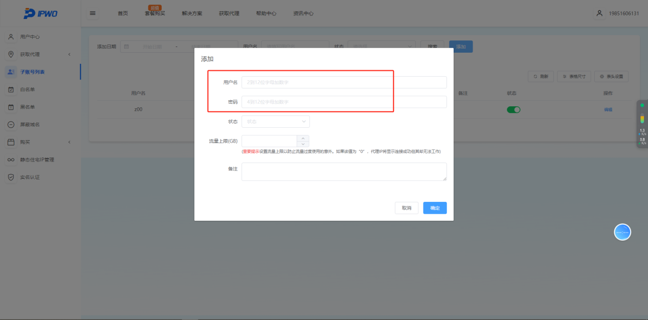 2. 账密认证提取代理IP,需创建认证账户:点击左侧菜单栏【子账号列表】——【添加】,设置账号、密码后点击【确定】即可