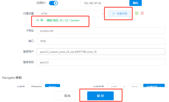 完成设置后,点击【检查网络】以验证代理的可用性。如果一切正常,您将能看到代理的信息,如下图。此时,您已成功设置代理。点击【保存】以保存代理配置。