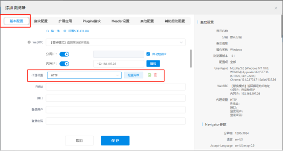 在【基本设置】选项,找到【代理设置】板块,点击【代理类型】并选择【HTTP】。将IPWO 生成的代理信息粘贴到 MuLogin中的相应字段中。