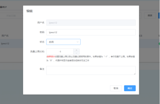 流量限制:设置为 -1 表示无上限;设置为 0 表示代理连接成功但无法使用。